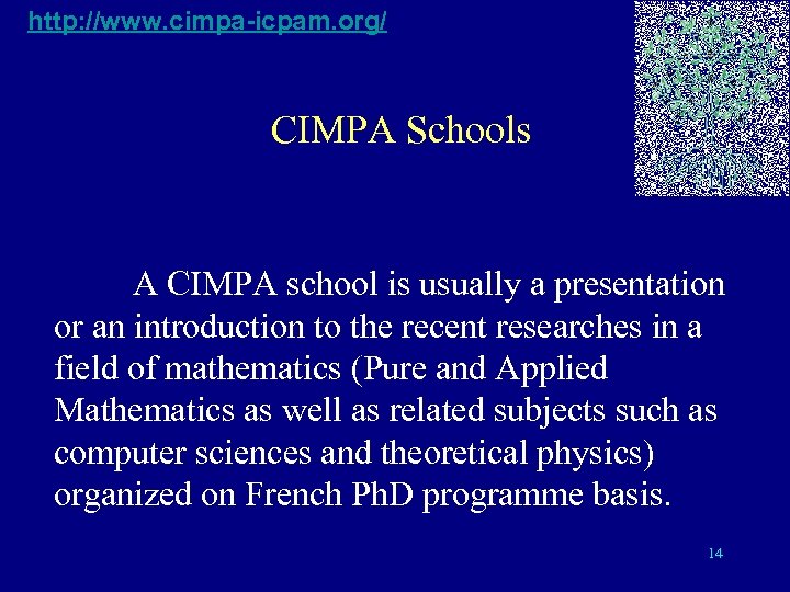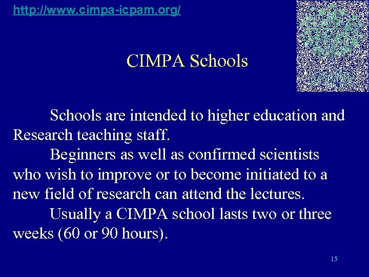 http: //www. cimpa-icpam. org/ CIMPA Schools A CIMPA school is usually a presentation or an introduction to the recent researches in a field of mathematics (Pure and Applied Mathematics as well as related subjects such as computer sciences and theoretical physics) organized on French Ph. D programme basis. 14