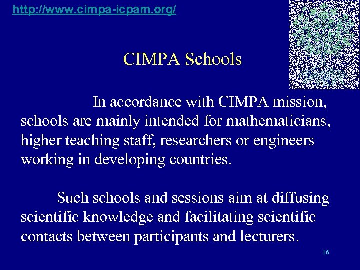 http: //www. cimpa-icpam. org/ CIMPA Schools are intended to higher education and Research teaching staff. Beginners as well as confirmed scientists who wish to improve or to become initiated to a new field of research can attend the lectures. Usually a CIMPA school lasts two or three weeks (60 or 90 hours). 15