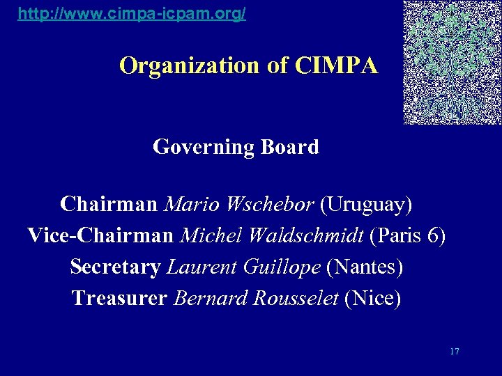 http: //www. cimpa-icpam. org/ Organization of CIMPA Governing Board Chairman Mario Wschebor (Uruguay) Vice-Chairman Michel Waldschmidt (Paris 6) Secretary Laurent Guillope (Nantes) Treasurer Bernard Rousselet (Nice) 17
