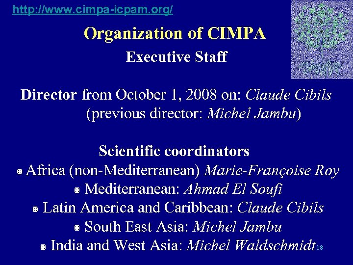 http: //www. cimpa-icpam. org/ Organization of CIMPA Executive Staff Director from October 1, 2008 on: Claude Cibils (previous director: Michel Jambu) Scientific coordinators Africa (non-Mediterranean) Marie-Françoise Roy Mediterranean: Ahmad El Soufi Latin America and Caribbean: Claude Cibils South East Asia: Michel Jambu India and West Asia: Michel Waldschmidt 18