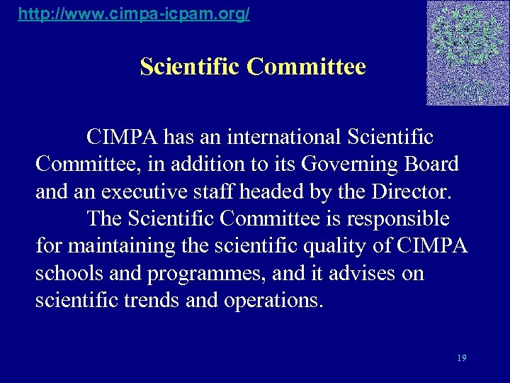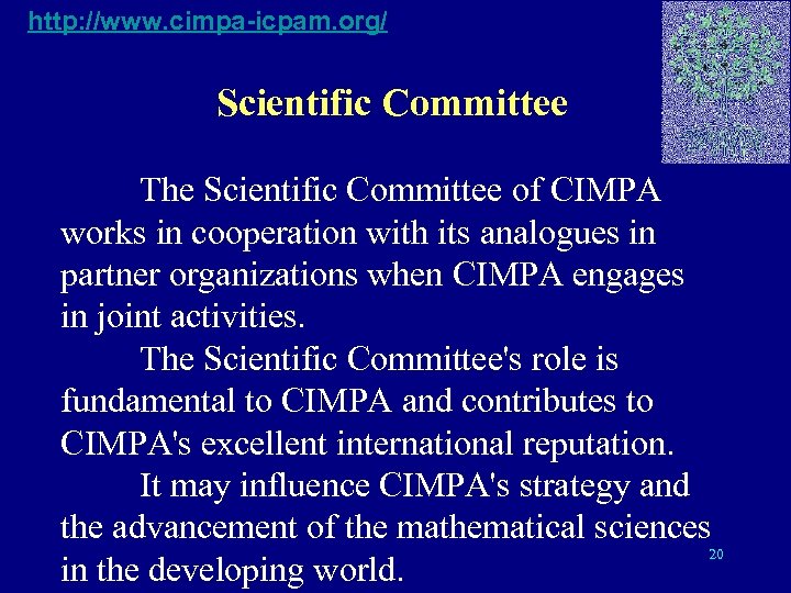 http: //www. cimpa-icpam. org/ Scientific Committee CIMPA has an international Scientific Committee, in addition to its Governing Board an executive staff headed by the Director. The Scientific Committee is responsible for maintaining the scientific quality of CIMPA schools and programmes, and it advises on scientific trends and operations. 19