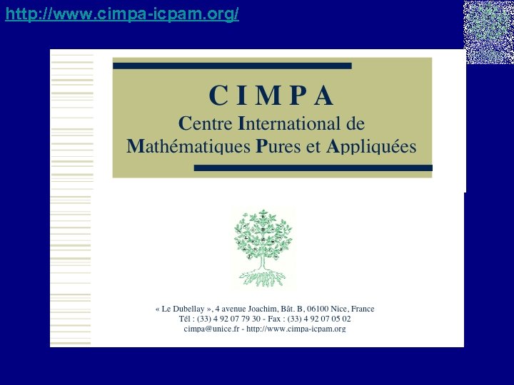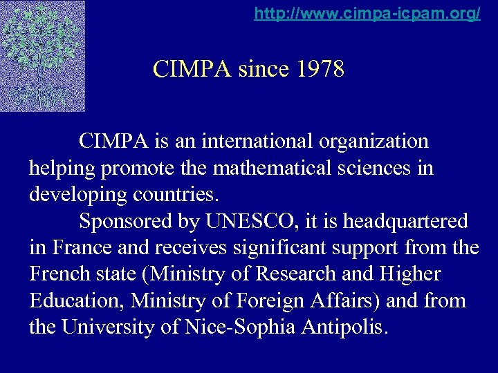 http: //www. cimpa-icpam. org/ CIMPA since 1978 CIMPA is an international organization helping promote the mathematical sciences in developing countries. Sponsored by UNESCO, it is headquartered in France and receives significant support from the French state (Ministry of Research and Higher Education, Ministry of Foreign Affairs) and from the University of Nice-Sophia Antipolis.