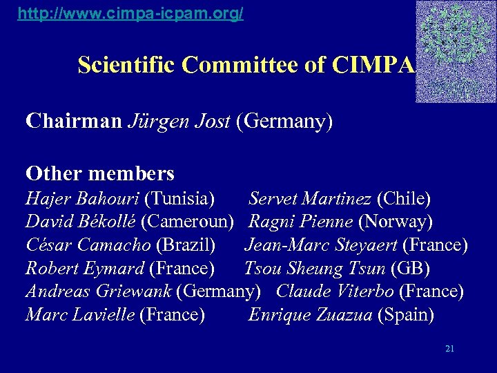 http: //www. cimpa-icpam. org/ Scientific Committee of CIMPA Chairman Jürgen Jost (Germany) Other members Hajer Bahouri (Tunisia) Servet Martinez (Chile) David Békollé (Cameroun) Ragni Pienne (Norway) César Camacho (Brazil) Jean-Marc Steyaert (France) Robert Eymard (France) Tsou Sheung Tsun (GB) Andreas Griewank (Germany) Claude Viterbo (France) Marc Lavielle (France) Enrique Zuazua (Spain) 21