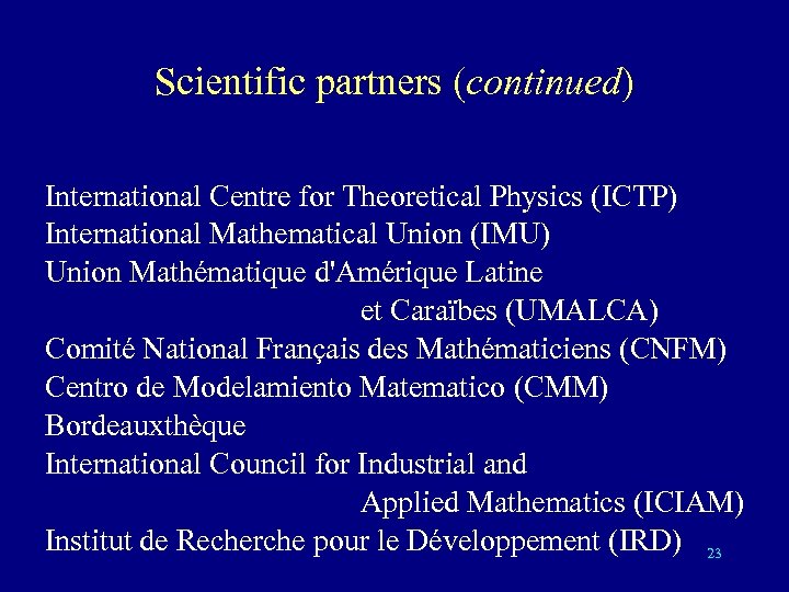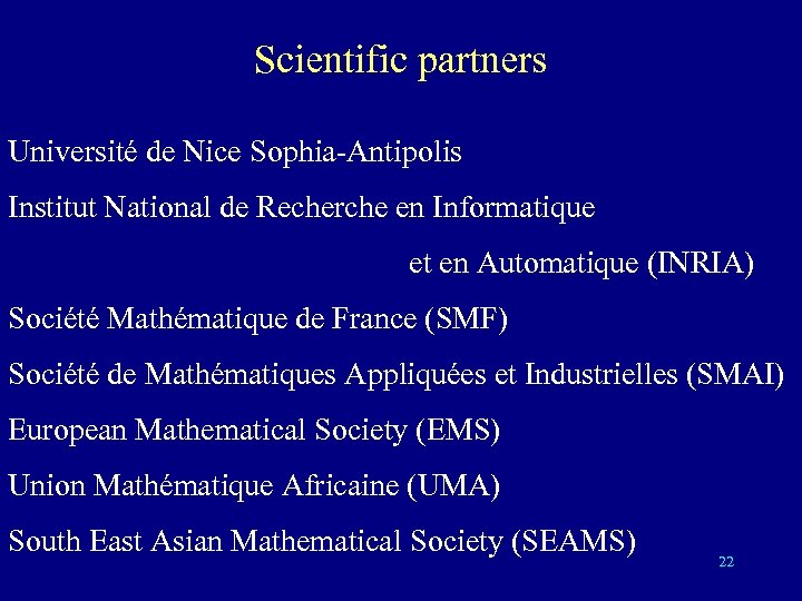 Scientific partners Université de Nice Sophia-Antipolis Institut National de Recherche en Informatique et en Automatique (INRIA) Société Mathématique de France (SMF) Société de Mathématiques Appliquées et Industrielles (SMAI) European Mathematical Society (EMS) Union Mathématique Africaine (UMA) South East Asian Mathematical Society (SEAMS) 22