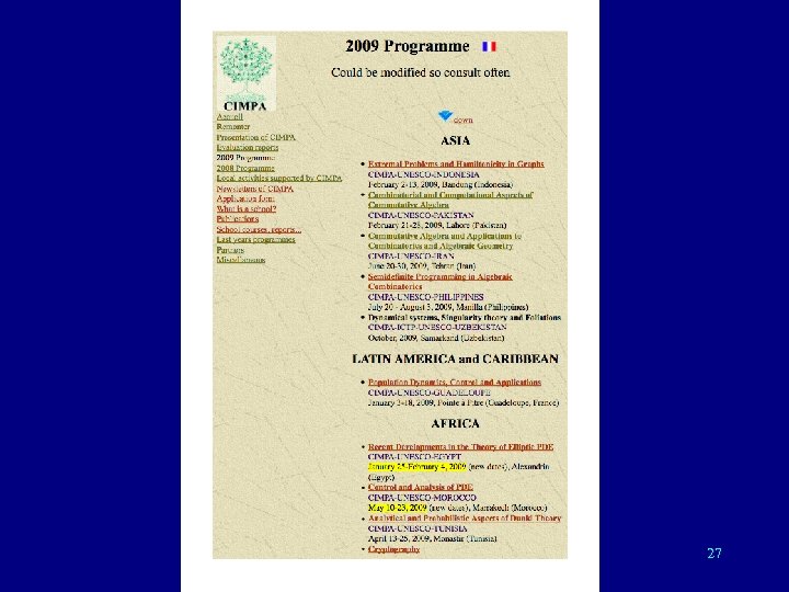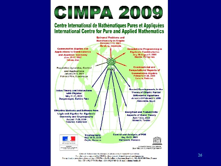 http: //www. cimpa-icpam. org/ Annual budget of CIMPA • ~ 234 500 € in 2008 not including salaries • ~ 293 000 € Including salaries • UNESCO : ~ 10 000 € • French Ministry of Research • Ministry of Foreign Affairs • Region, Nice University 25