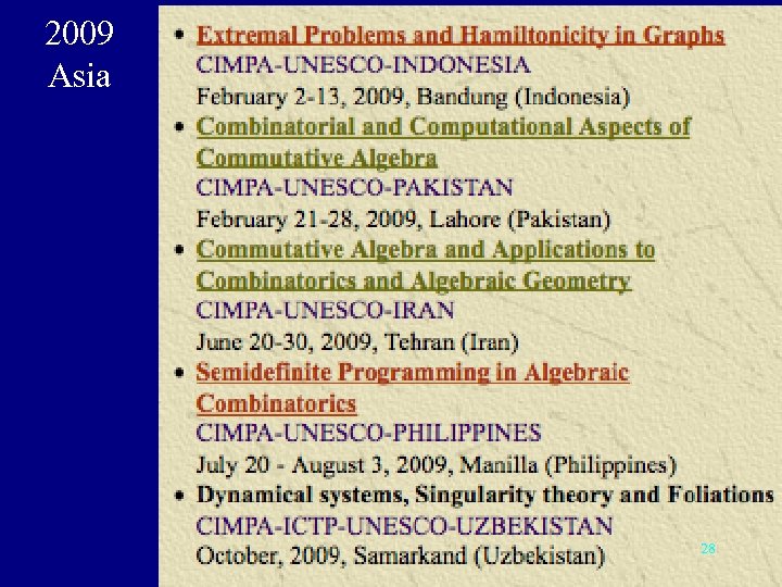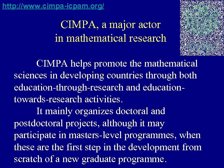 http: //www. cimpa-icpam. org/ CIMPA, a major actor in mathematical research CIMPA helps promote the mathematical sciences in developing countries through both education-through-research and educationtowards-research activities. It mainly organizes doctoral and postdoctoral projects, although it may participate in masters-level programmes, when these are the first step in the development from scratch of a new graduate programme.