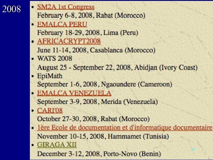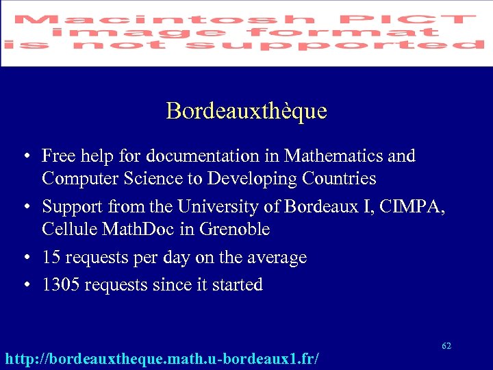 Bordeauxthèque • Free help for documentation in Mathematics and Computer Science to Developing Countries • Support from the University of Bordeaux I, CIMPA, Cellule Math. Doc in Grenoble • 15 requests per day on the average • 1305 requests since it started http: //bordeauxtheque. math. u-bordeaux 1. fr/ 62