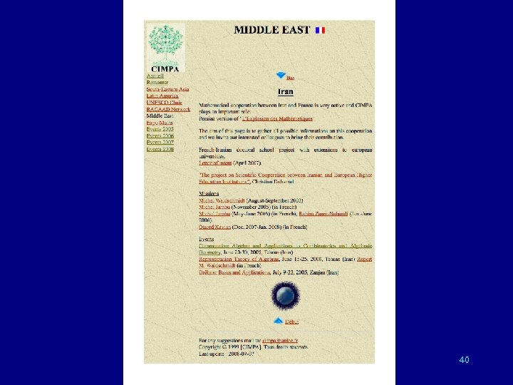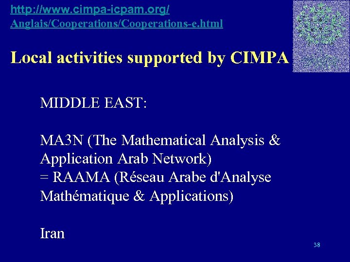 http: //www. cimpa-icpam. org/ Anglais/Cooperations-e. html Local activities supported by CIMPA MIDDLE EAST: MA 3 N (The Mathematical Analysis & Application Arab Network) = RAAMA (Réseau Arabe d'Analyse Mathématique & Applications) Iran 38