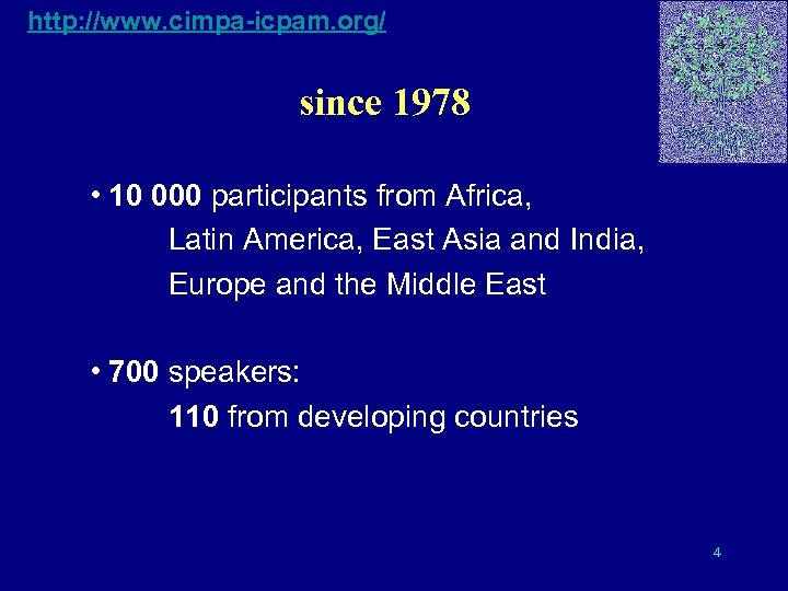http: //www. cimpa-icpam. org/ Activity of CIMPA since 1978 • 156 schools • 87 seminars, workshops, doctoral courses in the research fields of Pure and Applied Mathematics and Computer Science in 49 countries: • 17 in Africa • 9 in East Asia and India • 12 in Latin America and the Caribbeans • 8 in the Middle East • 3 in Eastern European Countries 3