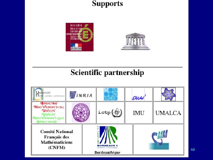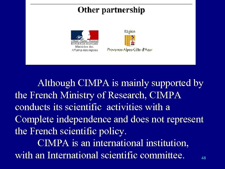 Although CIMPA is mainly supported by the French Ministry of Research, CIMPA conducts its scientific activities with a Complete independence and does not represent the French scientific policy. CIMPA is an international institution, with an International scientific committee. 48