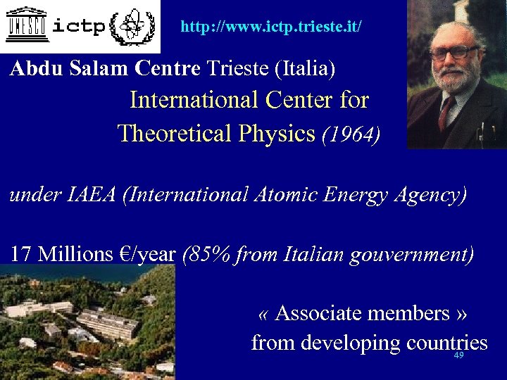 http: //www. ictp. trieste. it/ Abdu Salam Centre Trieste (Italia) International Center for Theoretical Physics (1964) under IAEA (International Atomic Energy Agency) 17 Millions €/year (85% from Italian gouvernment) « Associate members » from developing countries 49
