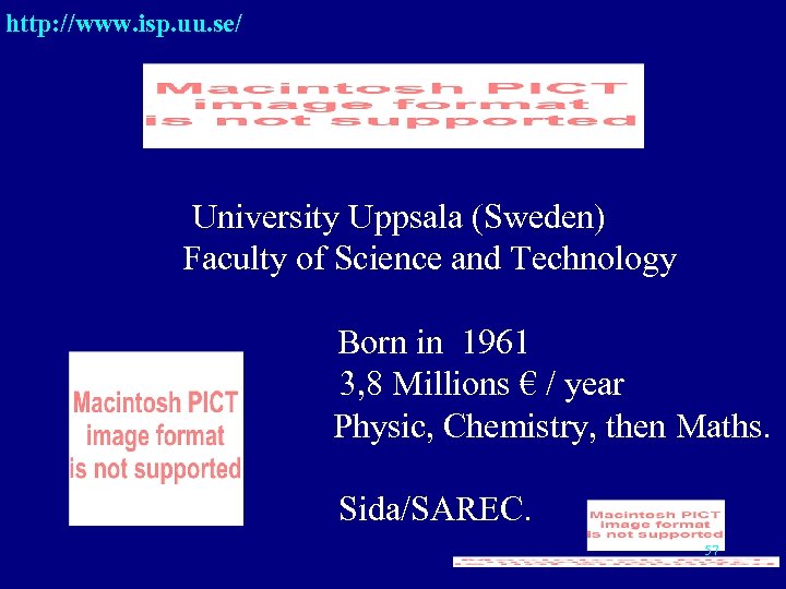 http: //www. isp. uu. se/ University Uppsala (Sweden) Faculty of Science and Technology Born in 1961 3, 8 Millions € / year Physic, Chemistry, then Maths. Sida/SAREC. 57