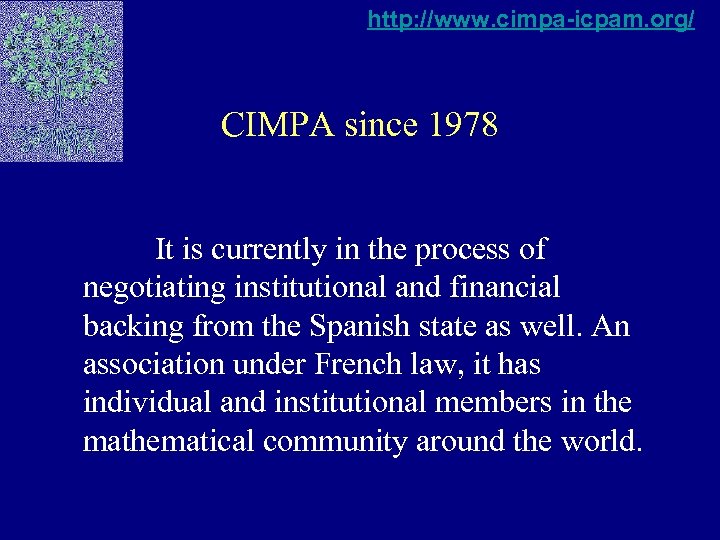 http: //www. cimpa-icpam. org/ CIMPA since 1978 It is currently in the process of negotiating institutional and financial backing from the Spanish state as well. An association under French law, it has individual and institutional members in the mathematical community around the world.