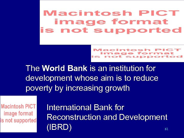 The World Bank is an institution for development whose aim is to reduce poverty by increasing growth International Bank for Reconstruction and Development (IBRD) 61