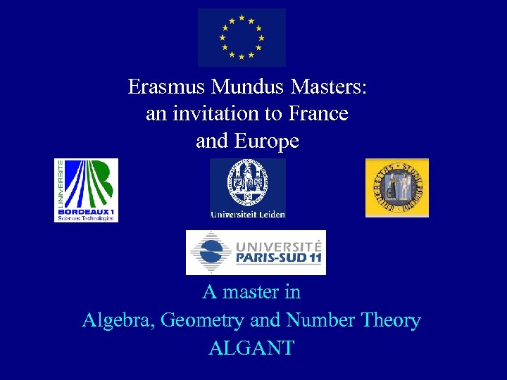 Erasmus Mundus Masters: an invitation to France and Europe A master in Algebra, Geometry and Number Theory ALGANT