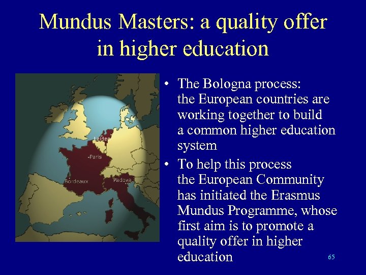 Mundus Masters: a quality offer in higher education • The Bologna process: the European countries are working together to build a common higher education system • To help this process the European Community has initiated the Erasmus Mundus Programme, whose first aim is to promote a quality offer in higher 65 education