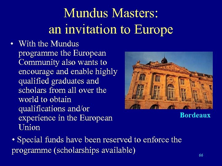 Mundus Masters: an invitation to Europe • With the Mundus programme the European Community also wants to encourage and enable highly qualified graduates and scholars from all over the world to obtain qualifications and/or Bordeaux experience in the European Union • Special funds have been reserved to enforce the programme (scholarships available) 66