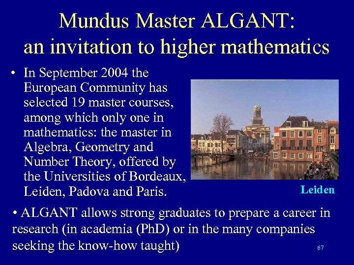 Mundus Master ALGANT: an invitation to higher mathematics • In September 2004 the European Community has selected 19 master courses, among which only one in mathematics: the master in Algebra, Geometry and Number Theory, offered by the Universities of Bordeaux, Leiden, Padova and Paris. Leiden • ALGANT allows strong graduates to prepare a career in research (in academia (Ph. D) or in the many companies seeking the know-how taught) 67
