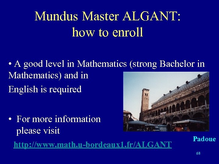 Mundus Master ALGANT: how to enroll • A good level in Mathematics (strong Bachelor in Mathematics) and in English is required • For more information please visit http: //www. math. u-bordeaux 1. fr/ALGANT Padoue 68