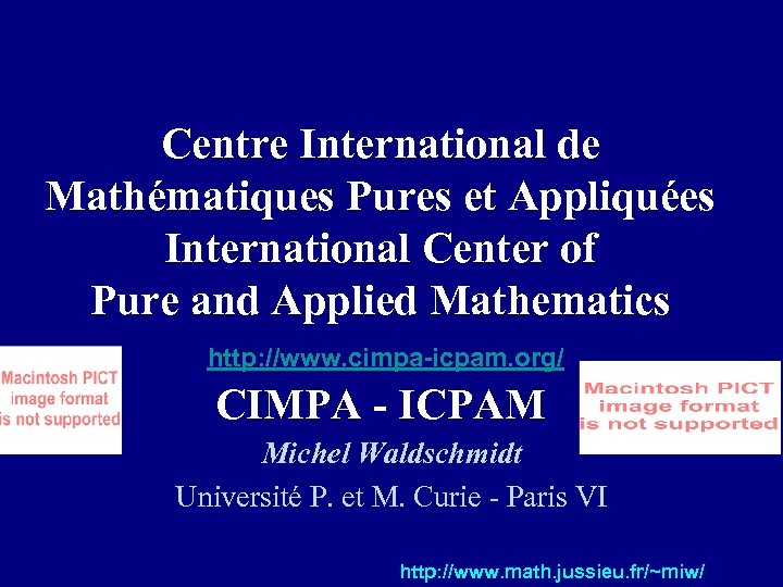Centre International de Mathématiques Pures et Appliquées International Center of Pure and Applied Mathematics http: //www. cimpa-icpam. org/ CIMPA - ICPAM Michel Waldschmidt Université P. et M. Curie - Paris VI http: //www. math. jussieu. fr/~miw/