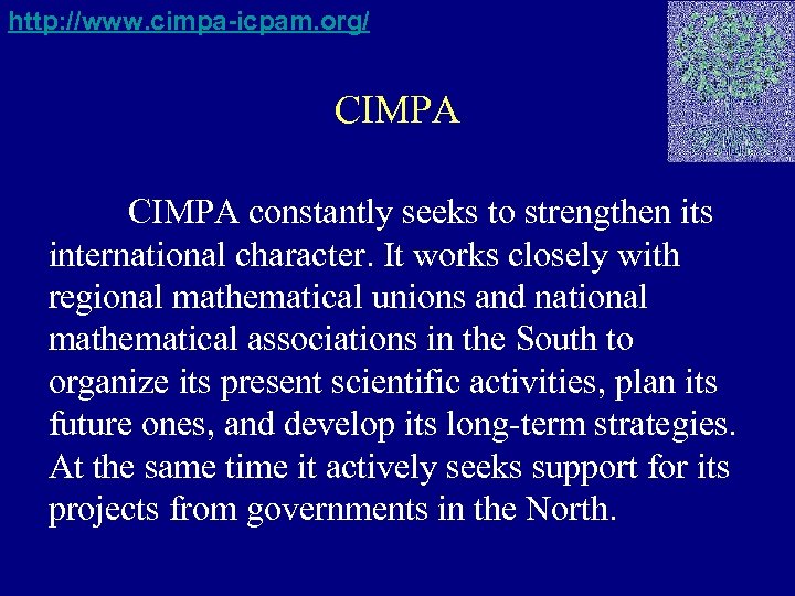 http: //www. cimpa-icpam. org/ CIMPA constantly seeks to strengthen its international character. It works closely with regional mathematical unions and national mathematical associations in the South to organize its present scientific activities, plan its future ones, and develop its long-term strategies. At the same time it actively seeks support for its projects from governments in the North.