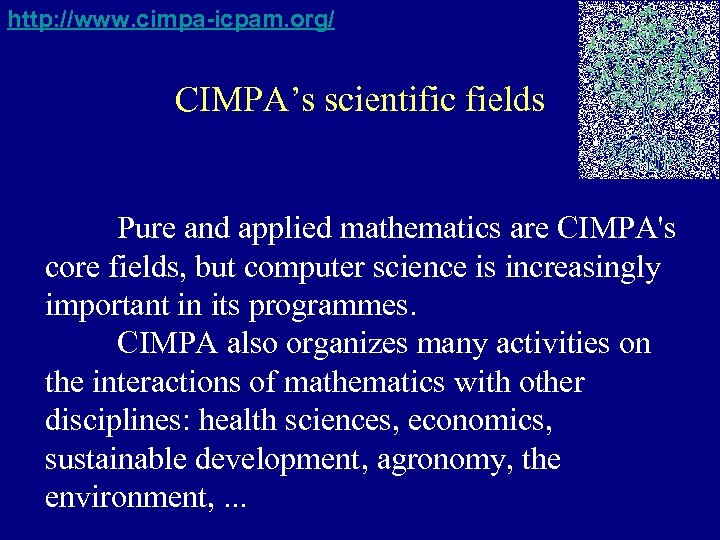 http: //www. cimpa-icpam. org/ CIMPA’s scientific fields Pure and applied mathematics are CIMPA's core fields, but computer science is increasingly important in its programmes. CIMPA also organizes many activities on the interactions of mathematics with other disciplines: health sciences, economics, sustainable development, agronomy, the environment, . . .