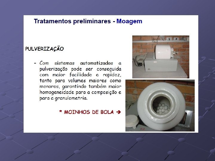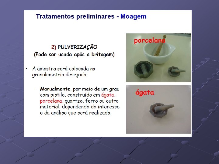 Sólidos: Material homogêneo: analito apresenta-se bem distribuído por toda a amostra. Retirar pequenas porções da amostra e triturar em almofariz ou moinho Material heterogêneo: analito apresenta-se não tão bem distribuído por toda a amostra, a amostra apresenta diferença quanto ao tamanho de partículas. Retirar pequenas porções da amostra e triturar em almofariz ou moinho