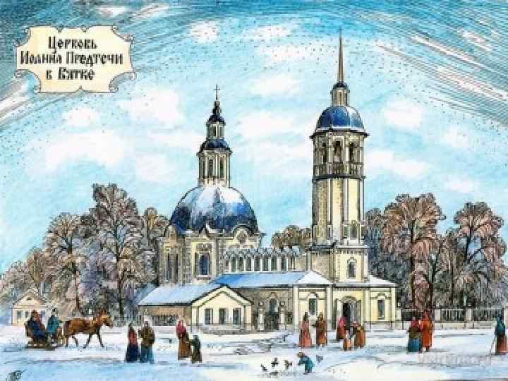 Главная n n n Церковь Иоанна Предтечи - один из редчайших памятников Вятского зодчества начала XVIII века. Начало постройки - 1711 год. В 1935 г. храм был закрыт. С 1994 года храм Иоанна Предтечи возвращен. Сейчас храм действует, совершаются утренние и вечерние службы и в течение всего дня присутствует священник. Также совершаются требы (венчания, отпевания, крещения, панихи ды, молебны, соборования и др. ).