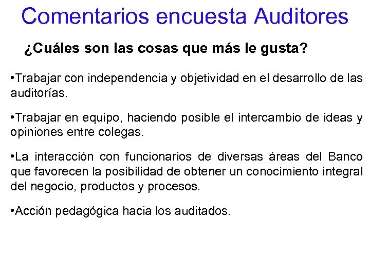 Comentarios encuesta Auditores ¿Cuáles son las cosas que más le gusta? • Trabajar con independencia y objetividad en el desarrollo de las auditorías. • Trabajar en equipo, haciendo posible el intercambio de ideas y opiniones entre colegas. • La interacción con funcionarios de diversas áreas del Banco que favorecen la posibilidad de obtener un conocimiento integral del negocio, productos y procesos. • Acción pedagógica hacia los auditados.