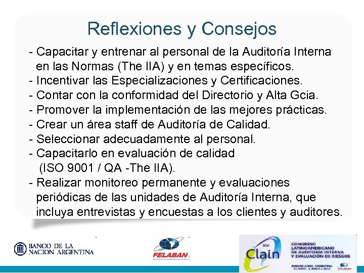Reflexiones y Consejos - Capacitar y entrenar al personal de la Auditoría Interna en las Normas (The IIA) y en temas específicos. - Incentivar las Especializaciones y Certificaciones. - Contar con la conformidad del Directorio y Alta Gcia. - Promover la implementación de las mejores prácticas. - Crear un área staff de Auditoría de Calidad. - Seleccionar adecuadamente al personal. - Capacitarlo en evaluación de calidad (ISO 9001 / QA -The IIA). - Realizar monitoreo permanente y evaluaciones periódicas de las unidades de Auditoría Interna, que incluya entrevistas y encuestas a los clientes y auditores.