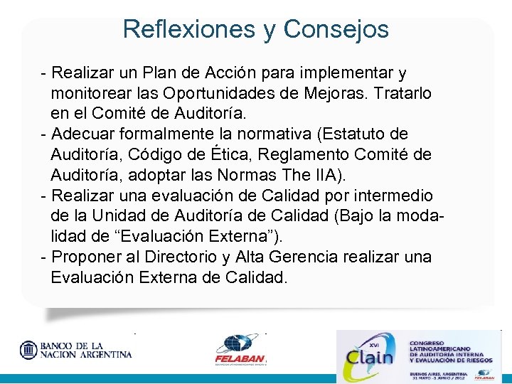 Reflexiones y Consejos - Realizar un Plan de Acción para implementar y monitorear las Oportunidades de Mejoras. Tratarlo en el Comité de Auditoría. - Adecuar formalmente la normativa (Estatuto de Auditoría, Código de Ética, Reglamento Comité de Auditoría, adoptar las Normas The IIA). - Realizar una evaluación de Calidad por intermedio de la Unidad de Auditoría de Calidad (Bajo la modalidad de “Evaluación Externa”). - Proponer al Directorio y Alta Gerencia realizar una Evaluación Externa de Calidad.