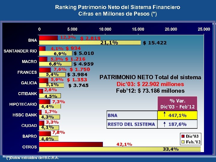 Ranking Patrimonio Neto del Sistema Financiero Cifras en Millones de Pesos (*) 12, 3% 4, 1% 6, 9% 5, 3% 6, 8% 7, 6% 5, 4% 5, 9% 5, 1% 2, 6% 4, 5% 7, 3% 4, 4% 1, 7% 4, 3% 3, 3% 4, 1% 7, 8% 21, 1% PATRIMONIO NETO Total del sistema Dic’ 03: $ 22. 902 millones Feb’ 12: $ 73. 186 millones 4, 0% 42, 1% (*)Datos extraídos del B. C. R. A. 33, 4%