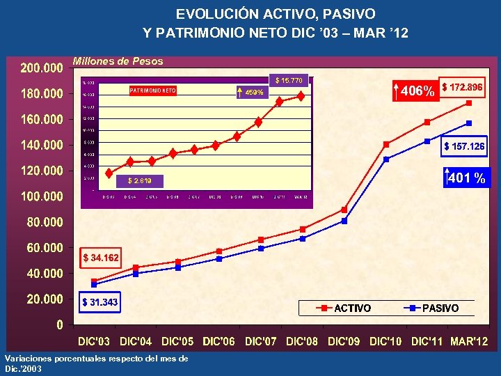 EVOLUCIÓN ACTIVO, PASIVO Y PATRIMONIO NETO DIC ’ 03 – MAR ’ 12 Millones de Pesos $ 15. 770 459% $ 2. 819 Variaciones porcentuales respecto del mes de Dic. ’ 2003 406% 401 %