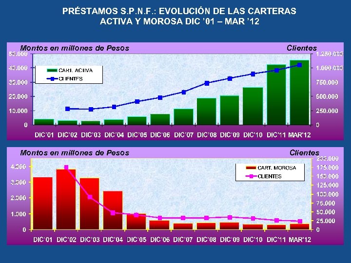 PRÉSTAMOS S. P. N. F. : EVOLUCIÓN DE LAS CARTERAS ACTIVA Y MOROSA DIC ’ 01 – MAR ’ 12 Montos en millones de Pesos Clientes