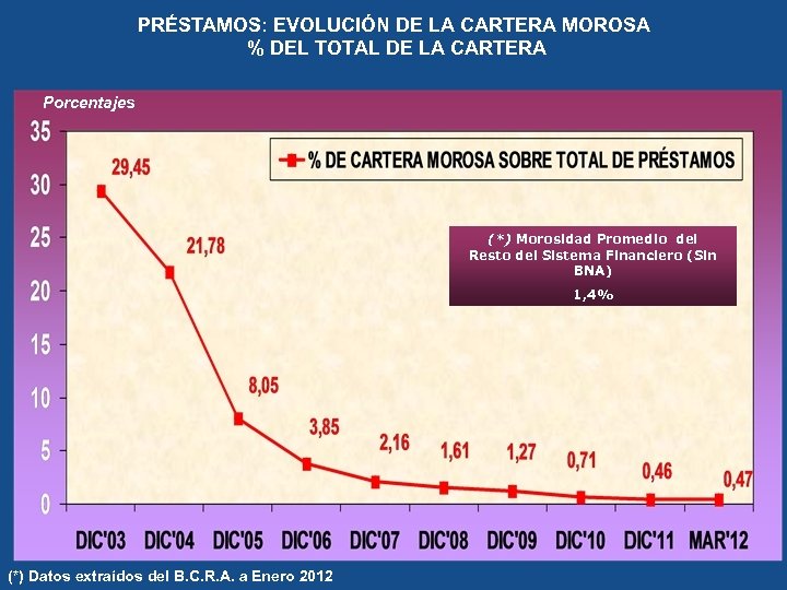 PRÉSTAMOS: EVOLUCIÓN DE LA CARTERA MOROSA % DEL TOTAL DE LA CARTERA Porcentajes (*) Morosidad Promedio del Resto del Sistema Financiero (Sin BNA) 1, 4% (*) Datos extraídos del B. C. R. A. a Enero 2012