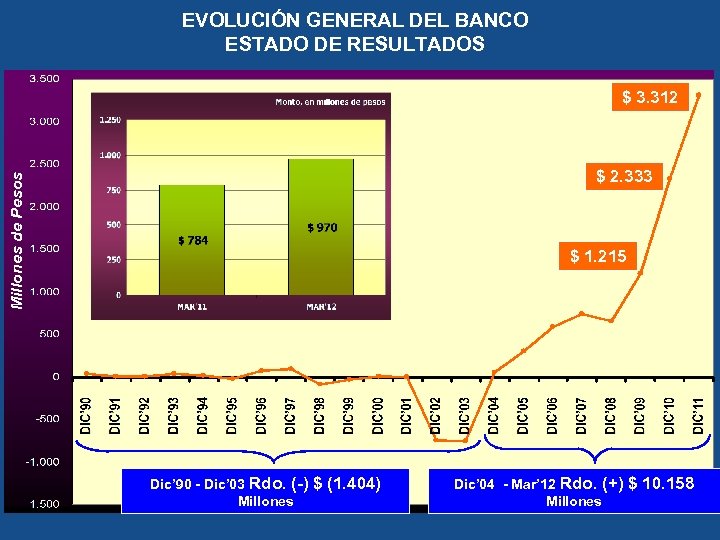 EVOLUCIÓN GENERAL DEL BANCO ESTADO DE RESULTADOS $ 3. 312 MILLONES DE PESOS Pesos Millones de MILLONES DE PESOS $ 2. 333 $ 1. 215 Dic’ 90 - Dic’ 03 Rdo. (-) $ (1. 404) Millones Dic’ 04 - Mar’ 12 Rdo. (+) $ 10. 158 Millones