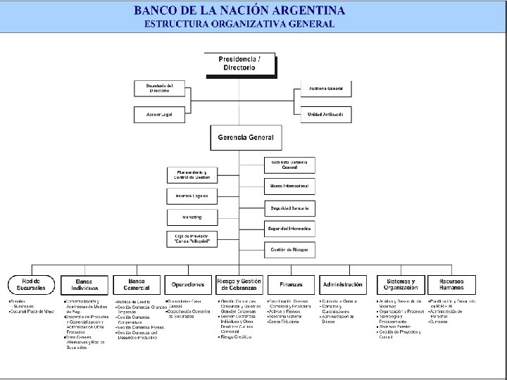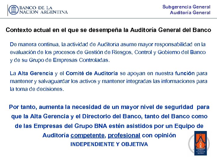Subgerencia General Auditoría General Contexto actual en el que se desempeña la Auditoría General del Banco De manera continua, la actividad de Auditoría asume mayor responsabilidad en la evaluación de los procesos de Gestión de Riesgos, Control y Gobierno del Banco y de su Grupo de Empresas Controladas. La Alta Gerencia y el Comité de Auditoría se apoyan en nuestra función para mantener y salvaguardar los activos y mantener integradas las informaciones para la toma de decisiones. Por tanto, aumenta la necesidad de un mayor nivel de seguridad para que la Alta Gerencia y el Directorio del Banco, tanto del Banco como de las Empresas del Grupo BNA estén asistidos por un Equipo de Auditoría competente, profesional con opinión INDEPENDIENTE Y OBJETIVA