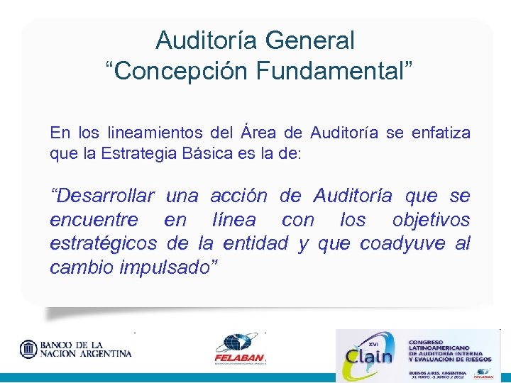 Auditoría General “Concepción Fundamental” En los lineamientos del Área de Auditoría se enfatiza que la Estrategia Básica es la de: “Desarrollar una acción de Auditoría que se encuentre en línea con los objetivos estratégicos de la entidad y que coadyuve al cambio impulsado”