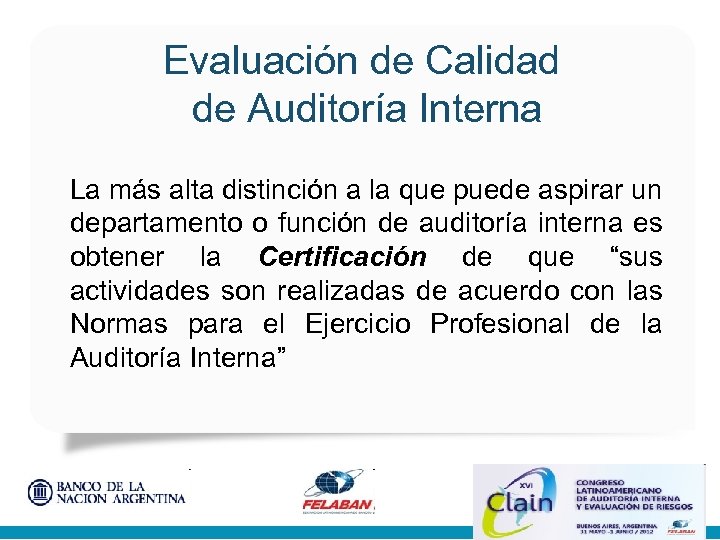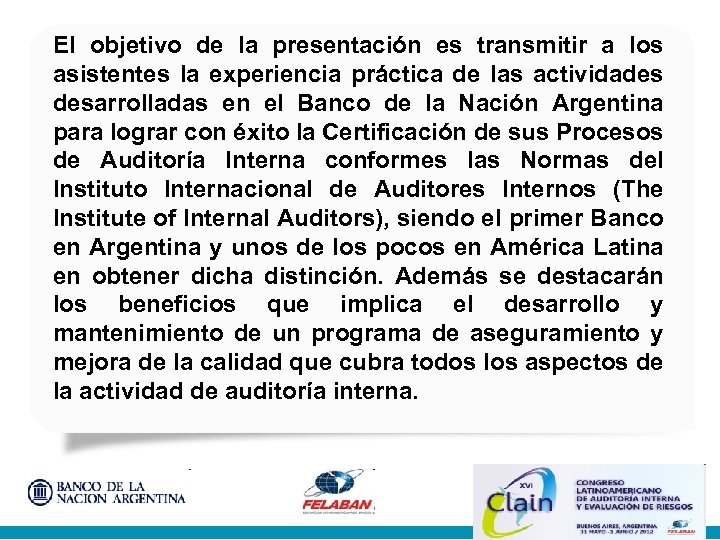 El objetivo de la presentación es transmitir a los asistentes la experiencia práctica de las actividades desarrolladas en el Banco de la Nación Argentina para lograr con éxito la Certificación de sus Procesos de Auditoría Interna conformes las Normas del Instituto Internacional de Auditores Internos (The Institute of Internal Auditors), siendo el primer Banco en Argentina y unos de los pocos en América Latina en obtener dicha distinción. Además se destacarán los beneficios que implica el desarrollo y mantenimiento de un programa de aseguramiento y mejora de la calidad que cubra todos los aspectos de la actividad de auditoría interna.
