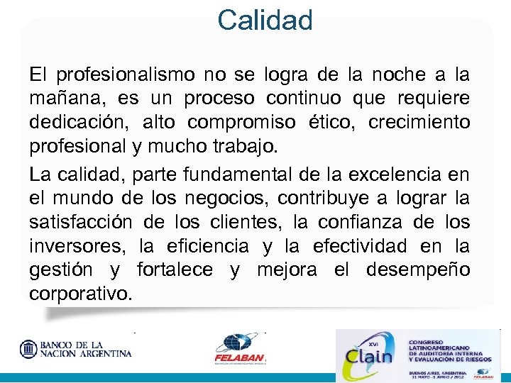 Calidad El profesionalismo no se logra de la noche a la mañana, es un proceso continuo que requiere dedicación, alto compromiso ético, crecimiento profesional y mucho trabajo. La calidad, parte fundamental de la excelencia en el mundo de los negocios, contribuye a lograr la satisfacción de los clientes, la confianza de los inversores, la eficiencia y la efectividad en la gestión y fortalece y mejora el desempeño corporativo.