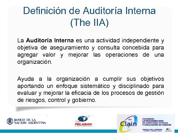Definición de Auditoría Interna (The IIA) La Auditoría Interna es una actividad independiente y objetiva de aseguramiento y consulta concebida para agregar valor y mejorar las operaciones de una organización. Ayuda a la organización a cumplir sus objetivos aportando un enfoque sistemático y disciplinado para evaluar y mejorar la eficacia de los procesos de gestión de riesgos, control y gobierno.