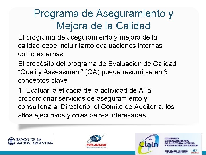 Programa de Aseguramiento y Mejora de la Calidad El programa de aseguramiento y mejora de la calidad debe incluir tanto evaluaciones internas como externas. El propósito del programa de Evaluación de Calidad “Quality Assessment” (QA) puede resumirse en 3 conceptos clave: 1 - Evaluar la eficacia de la actividad de AI al proporcionar servicios de aseguramiento y consultoría al Directorio, el Comité de Auditoría, los altos ejecutivos y otras partes interesadas.