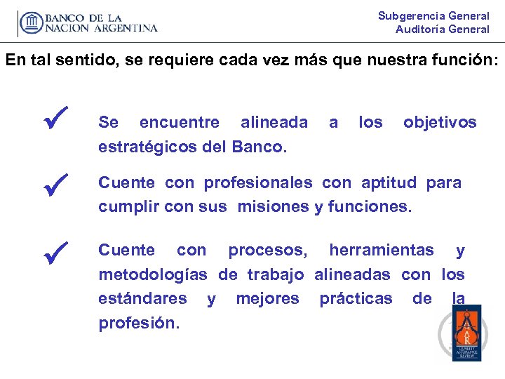 Subgerencia General Auditoría General En tal sentido, se requiere cada vez más que nuestra función: P Se encuentre alineada a los objetivos estratégicos del Banco. P Cuente con profesionales con aptitud para cumplir con sus misiones y funciones. P Cuente con procesos, herramientas y metodologías de trabajo alineadas con los estándares y mejores prácticas de la profesión.