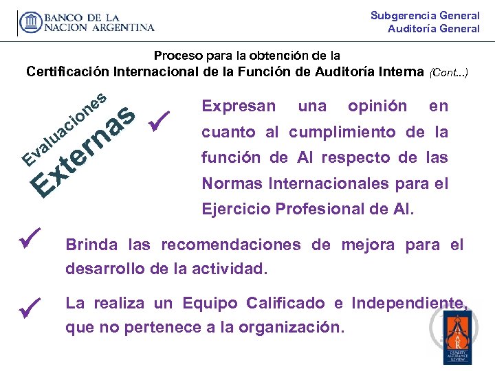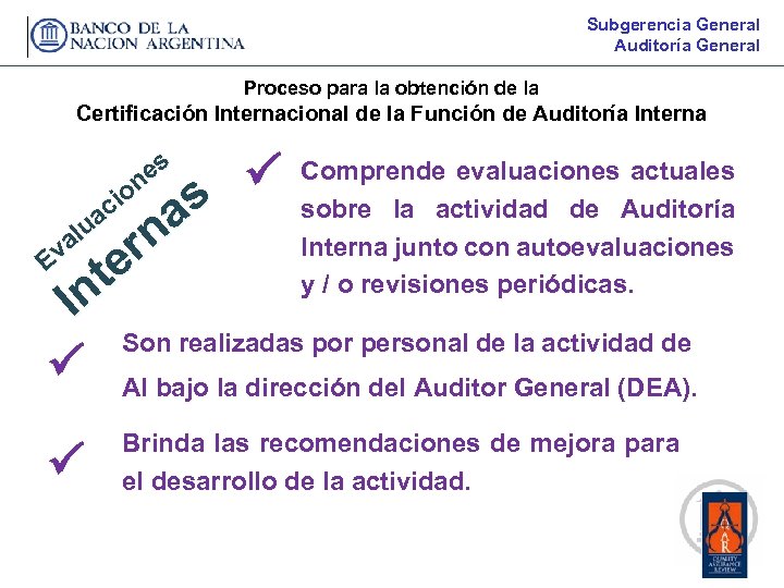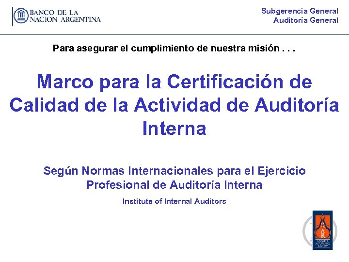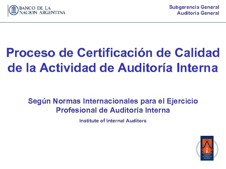 Subgerencia General Auditoría General A partir del 23 de Setiembre de 2011. . . La Subgerencia General Auditoría General del Banco de la Nación Argentina Logró la CERTIFICACION Según Normas Internacionales para el Ejercicio Profesional de Auditoría Interna Otorgada por IAIA (Instituto de Auditores Internos de Argentina de manera conjunta con el IAIE (Instituto de Auditores Internos de España)