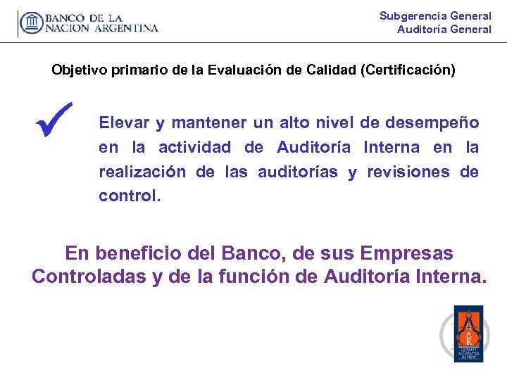 Subgerencia General Auditoría General Objetivo primario de la Evaluación de Calidad (Certificación) P Elevar y mantener un alto nivel de desempeño en la actividad de Auditoría Interna en la realización de las auditorías y revisiones de control. En beneficio del Banco, de sus Empresas Controladas y de la función de Auditoría Interna.