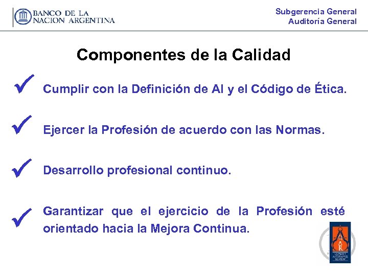 Subgerencia General Auditoría General Componentes de la Calidad P Cumplir con la Definición de AI y el Código de Ética. P Ejercer la Profesión de acuerdo con las Normas. P Desarrollo profesional continuo. P Garantizar que el ejercicio de la Profesión esté orientado hacia la Mejora Continua.