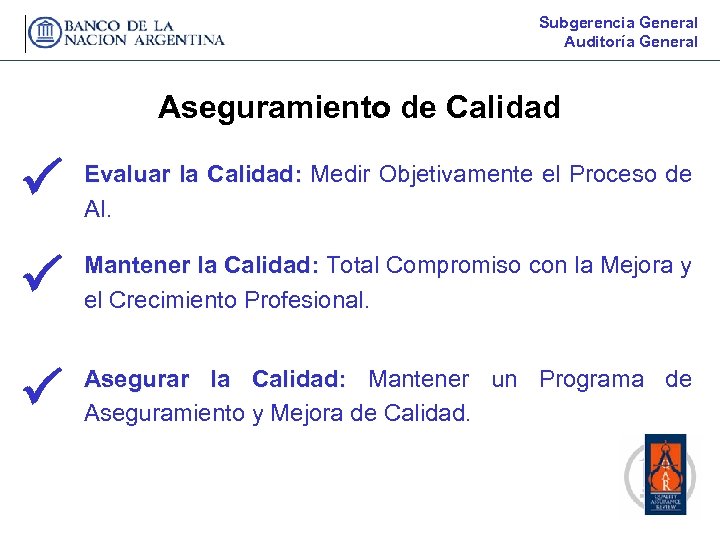 Subgerencia General Auditoría General Aseguramiento de Calidad P Evaluar la Calidad: Medir Objetivamente el Proceso de AI. P Mantener la Calidad: Total Compromiso con la Mejora y Calidad: el Crecimiento Profesional. P Asegurar la Calidad: Mantener un Programa de Calidad: Aseguramiento y Mejora de Calidad.