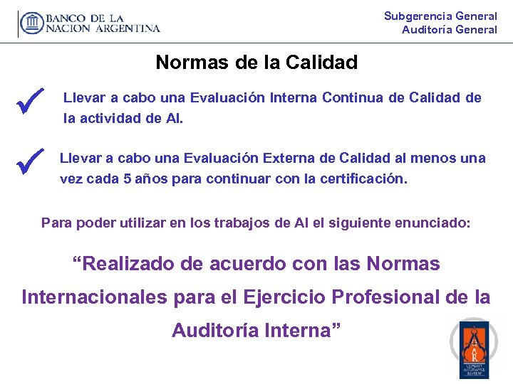 Subgerencia General Auditoría General Conforme lo detallan las Normas Internacionales para el Ejercicio Profesional de AI (IIA – IAIA) 1300 Programa de aseguramiento y mejora de la calidad El Director Ejecutivo de Auditoría debe desarrollar y mantener un programa de aseguramiento y mejora de la calidad que cubra todos los aspectos de la actividad de auditoría interna. 1310 Requisitos del programa de aseguramiento y mejora de la calidad El programa de aseguramiento y mejora de la calidad debe incluir tanto evaluaciones internas como externas.
