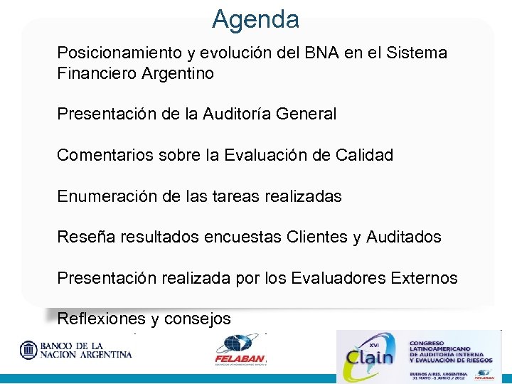 Agenda Posicionamiento y evolución del BNA en el Sistema Financiero Argentino Presentación de la Auditoría General Comentarios sobre la Evaluación de Calidad Enumeración de las tareas realizadas Reseña resultados encuestas Clientes y Auditados Presentación realizada por los Evaluadores Externos Reflexiones y consejos