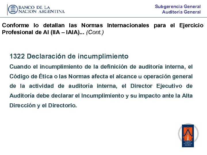 Subgerencia General Auditoría General Conforme lo detallan las Normas Internacionales para el Ejercicio Profesional de AI (IIA – IAIA). . . (Cont. ) 1322 Declaración de incumplimiento Cuando el incumplimiento de la definición de auditoría interna, el Código de Ética o las Normas afecta el alcance u operación general de la actividad de auditoría interna, el Director Ejecutivo de Auditoría debe declarar el Incumplimiento y su impacto ante la Alta Dirección y el Directorio.
